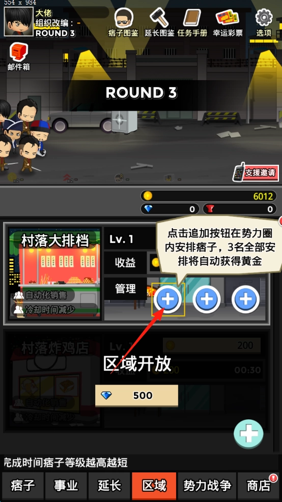 进入区域界面后,点击追加按钮,安排痞子人员,进行产业管理,从而获取黄金收益。