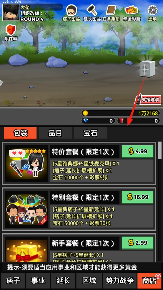 打开商店,挑选套餐,获取痞子和道具,提升实力,为发展提供助力。