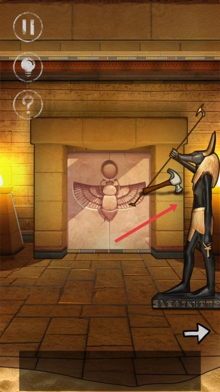 3、回到初始场景,将锤子对准神像手中的权杖,点击以触发互动,让权杖发生变化,从而促使石门机关开始运转。