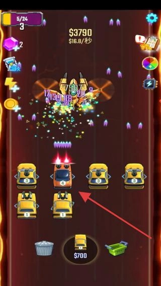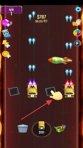 点击“空位”放置新车,组合运用导弹与光束等火力,系统自动射击清理屏幕,赚取金币($3790→$2318)。