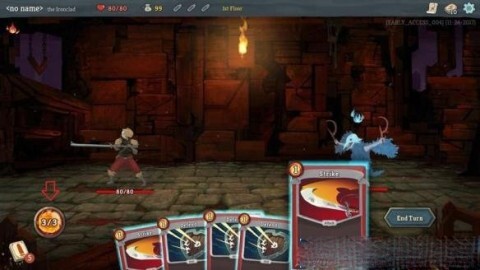 3. 当你点击冒险地图上的节点图标开启冒险,如果该节点遭遇敌人,就会触发战斗。在战斗过程中,你需要巧妙运用卡组里的卡牌来对抗敌人。在游戏刚开始的时候,每回合你能够从卡组抽取5张卡牌,同时要留意左下角的能量球,它所展示的是你本回合能够使用的能量值。