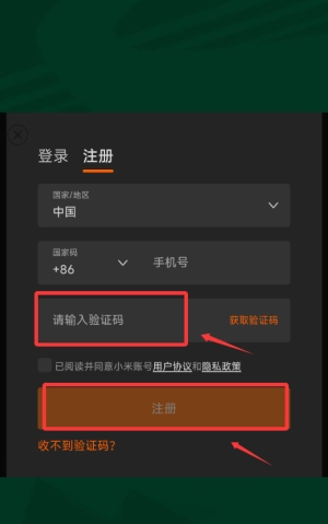 勾选用户协议后填写验证码,再点击橙色的注册按钮,即可完成操作。