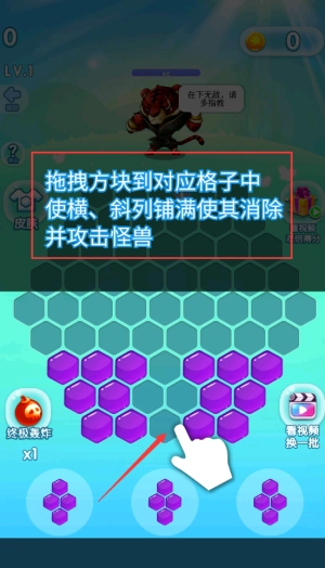 拖拽红框紫色方块,填满横斜线攻击老虎怪兽。