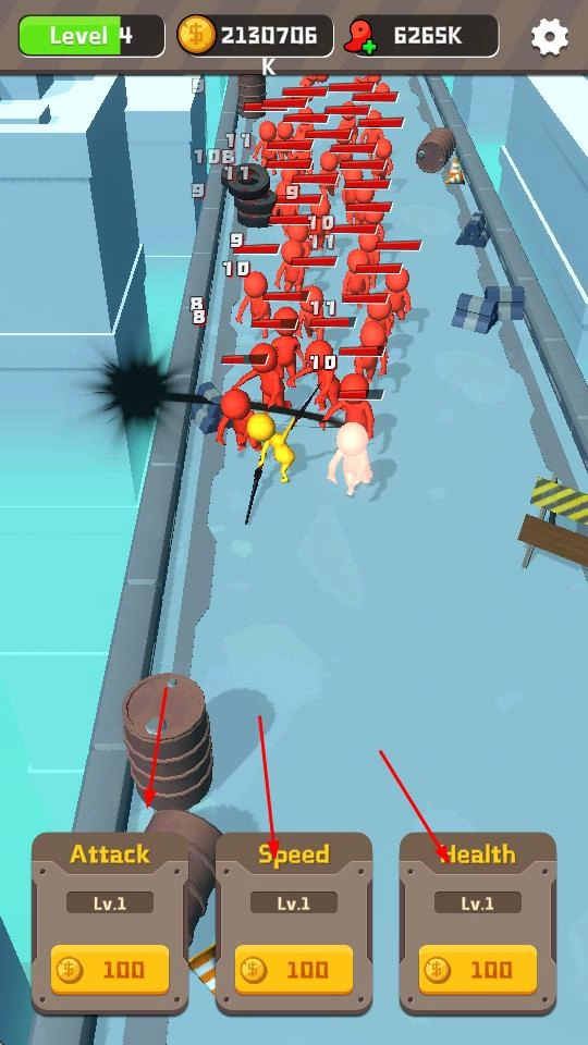 进入游戏后,操控黄色小人在赛道上与众多红色小人展开战斗,借助屏幕下方的攻击、速度、生命值等属性升级按钮,消耗金币来提升角色属性。