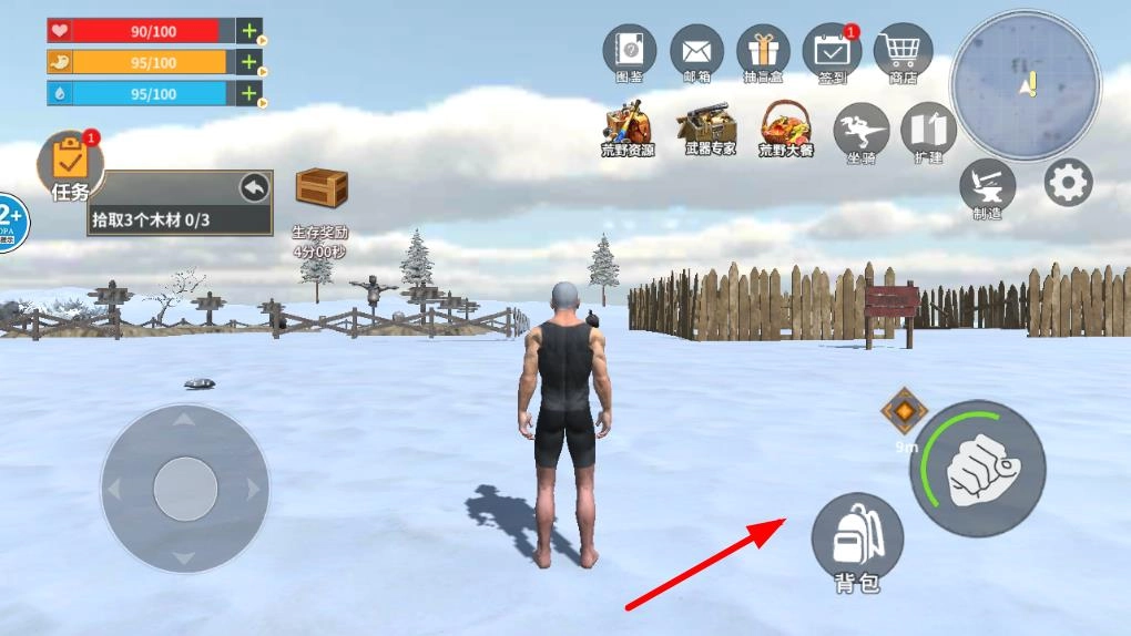 进入游戏后,先在冰封的初始区域捡拾枯枝和石块,用这些材料打造简易斧头与火把,借助它们来抵挡夜晚突然降临的酷寒,以及防范随时可能现身的野兽攻击。
