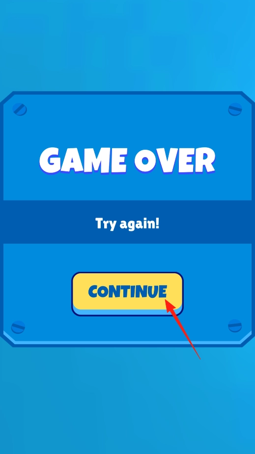 游戏结束了,屏幕上显示着GAME OVER,点击CONTINUE按钮就能重新开启游戏,再次发起挑战,瞧瞧这次能否顺利通关。