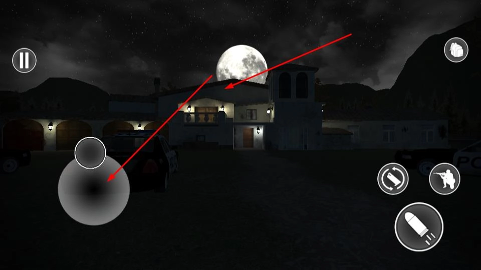 进入游戏后,可借助左侧的虚拟摇杆来控制角色的移动,右侧的按键则用于切换武器以及查看道具,之后朝着豪宅的方向前进。