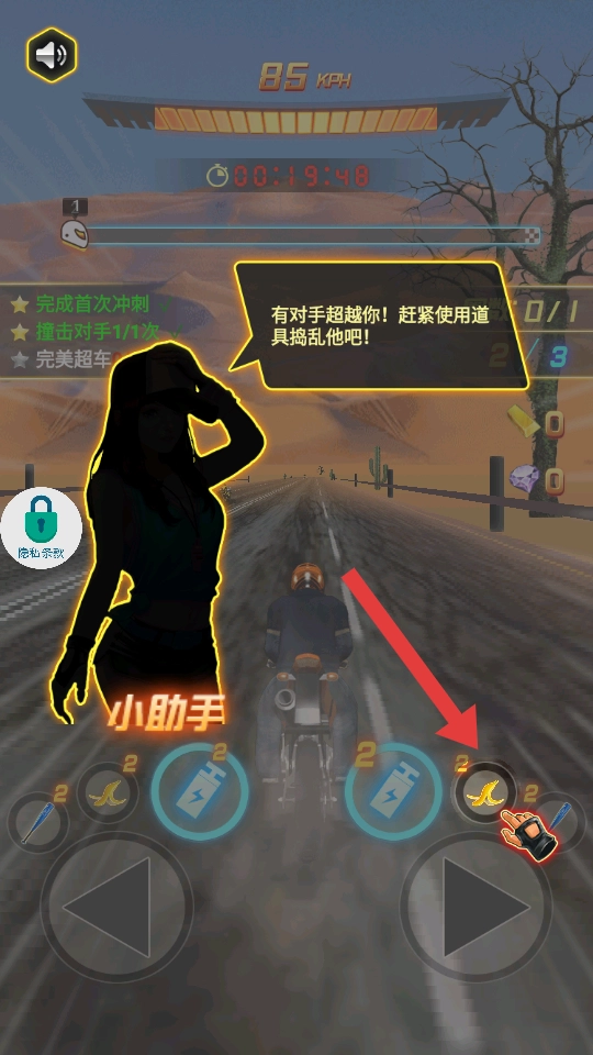 当对手超越你时,你可以点击右侧香蕉形状的道具图标,利用干扰类道具来阻碍对手继续前进。