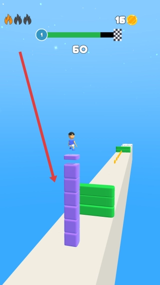 在关卡里不断点击屏幕来堆叠紫色方块,利用这些堆叠起来的方块搭建出能通行的路径,帮助角色越过绿色障碍,让跑酷进程继续推进。