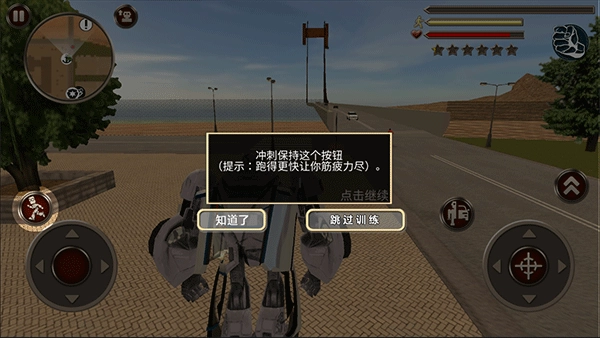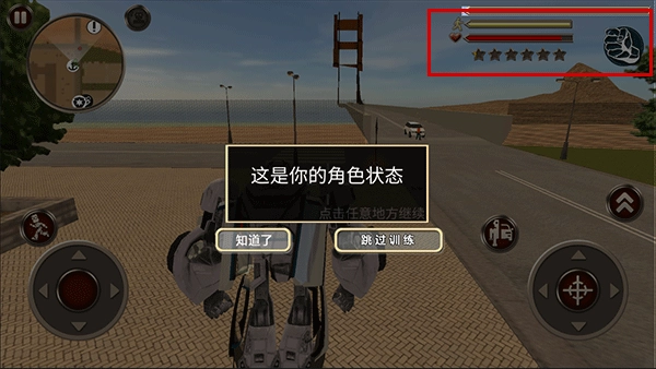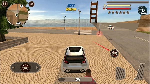 游戏界面的右上角会显示角色的三项状态信息,分别对应体力值、生命值以及通缉等级(温馨提示:请避免随意攻击路人,否则会触发警察的通缉机制)。此外,通过点击拳头形状的按钮,你可以实现武器的切换操作。