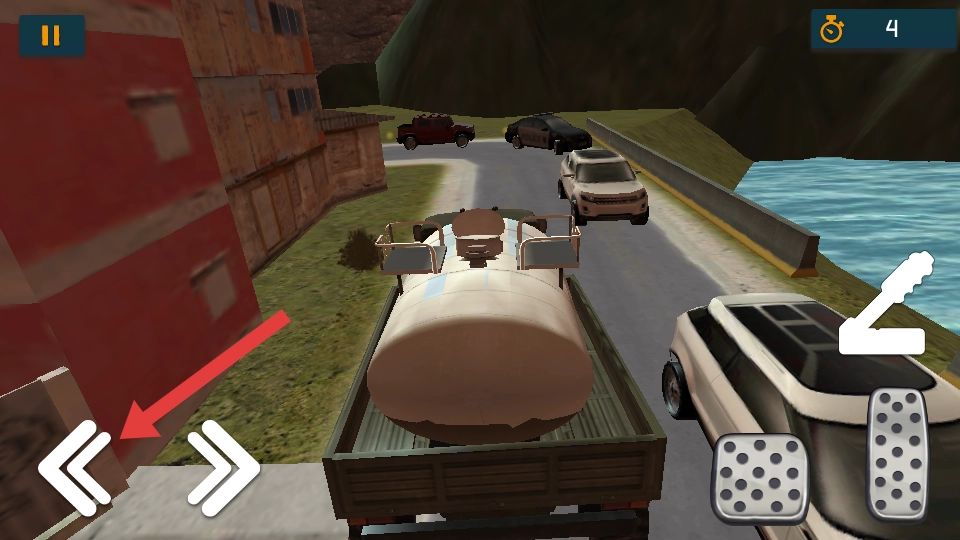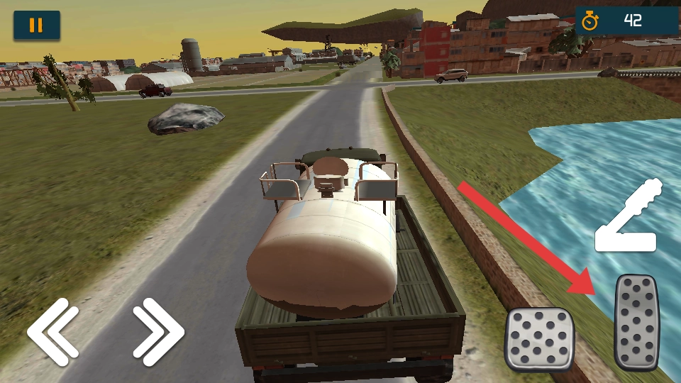 左侧的左右箭头按钮用于操控油罐车的转向,右侧区域里,带点的踏板是加速键,长踏板则为刹车键,需依据实际情况灵活调整车辆的行驶方向。