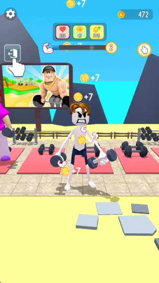 就像图里展示的那样,只要点击屏幕就能让角色开始锻炼,点击的速度越快,角色锻炼的节奏就越紧凑,相应地,获得金币的效率也会随之提升。
