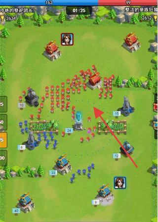 3、战斗界面(部落对战场景),展示基地布局,红蓝双方兵种展开交战,围绕核心建筑进行攻防,以此呈现游戏的核心对战玩法。
