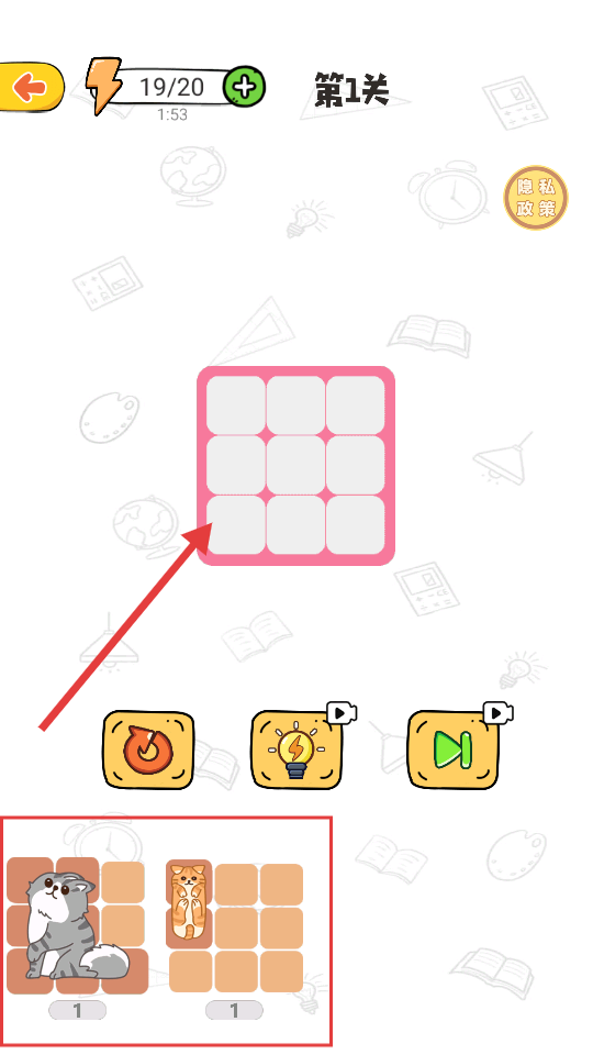 2、来到第1关,将下方的猫咪拖拽至上方网格,完成拼图填充。