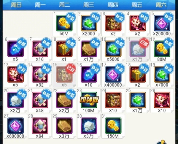这里面的奖励特别丰厚,有海量的金币、徽章,还有钻石和装备之类的,能让你的战斗力一下子提升好几倍呢。提醒一下:要是赶上有返现活动的时候再去补签钻石这些,就能享受到七折补签的优惠哦。