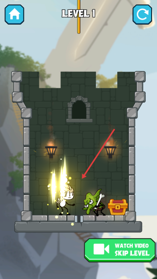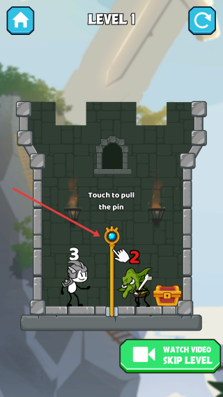 1、观察Level1场景的布局,留意英雄、怪物和宝箱的位置,找到标有“Touch to pull the pin”的金色销钉。