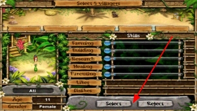 进入游戏后,能够查看村民的各项技能等信息,依据村庄发展的需求,挑选合适的村民,点击选择按钮来确定村民人选,以此为村庄建设储备人力。