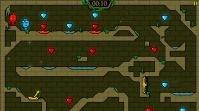 2. 当液体覆盖的区域过大,导致角色无法直接通过时,可寻找场景中的机关与石块,操控与该液体颜色相同的冰火人推动石块,在液体区域内铺出一条通路,以便另一个冰火人顺利通过。