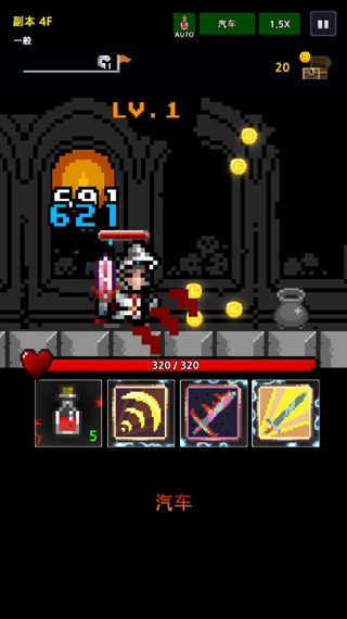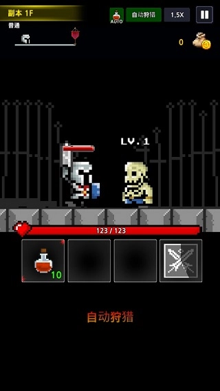屏幕上方是你操控的角色,既可以手动操作也能开启自动战斗模式。右上角有个宝箱,旁边显示着你获得的金币数量。左上角有个头像和红色旗帜,红旗标记着终点位置,当你的头像抵达那里就意味着通关了。