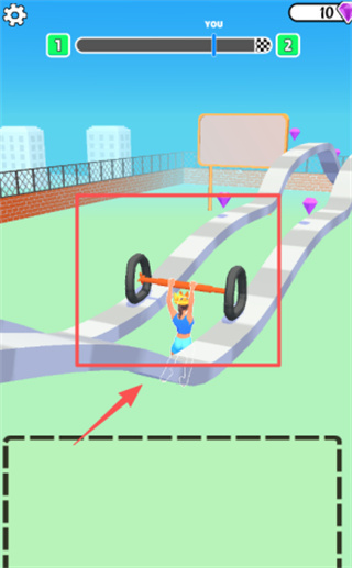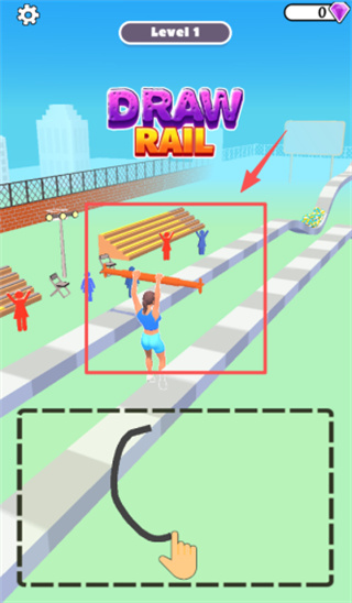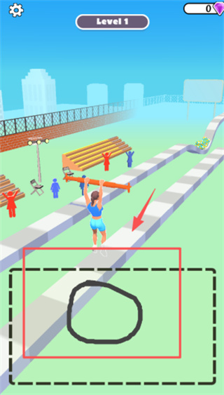 3、点击红色虚线框引出的箭头所在区域,或是绘制波浪状轨道,帮助举杠铃的人物避开紫色菱形的障碍。