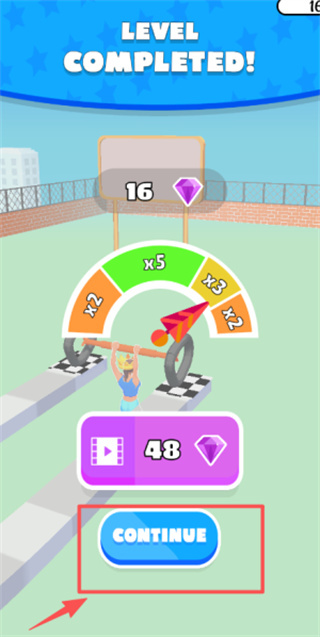 4、在通关界面,可点击蓝色的“CONTINUE”按钮,也能查看上方的金币、钻石和倍率表,之后进入下一关。