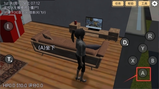 4、按下右下角标有字母A的功能键,就能切换角色至坐下休息的状态。
