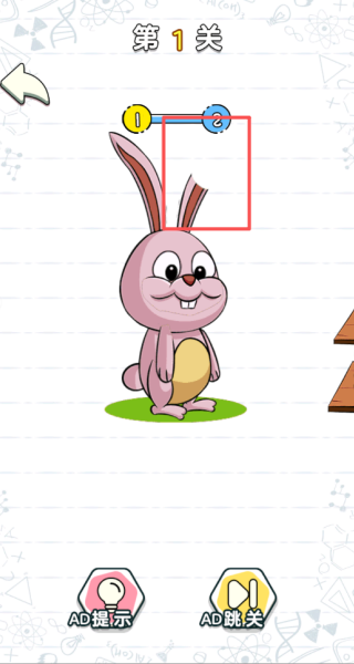 以补全脑洞这一类型为例,当你进入第一关时,要做的就是把小兔子缺失的耳朵部分补齐。