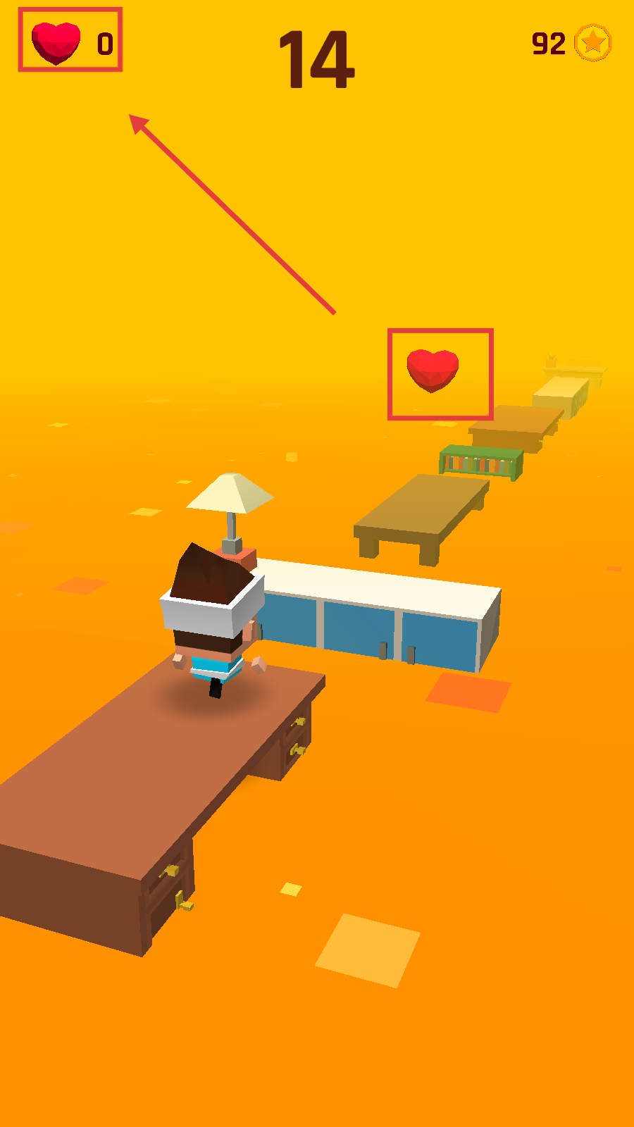 4、留意左上角的爱心,要是不慎掉入熔岩区域会扣除生命值,记得尽可能收集场景里的爱心道具来补充,维持生存状态,增加跳跃奔跑的时间,朝着更高分数冲刺吧。