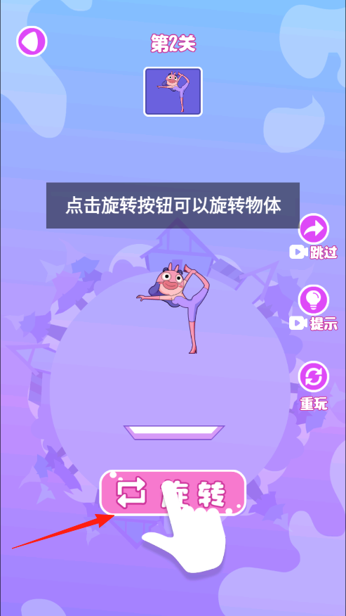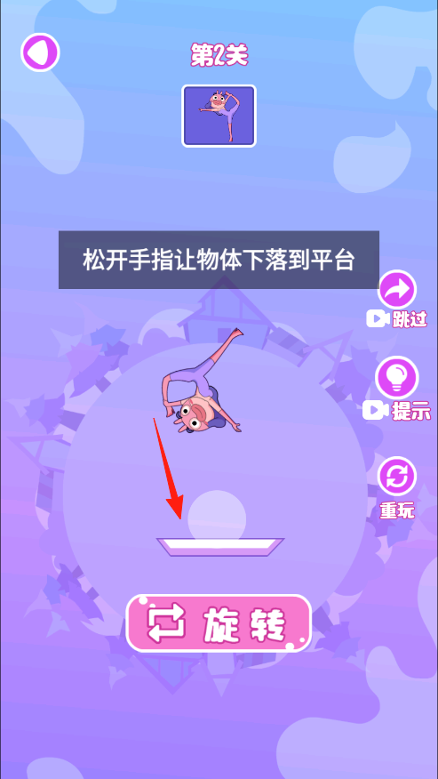 2、第二关,点击旋转按钮转动角色,调整至合适角度后松开,使其落到平台上并保持平衡,即可完成挑战。