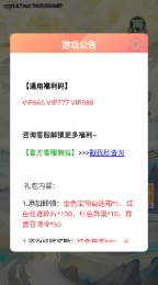 进入游戏前,记得使用礼包码VIP666、VIP777、VIP888就能领取奖励,另外添加客服还能获得金色宝物之类的礼物。
