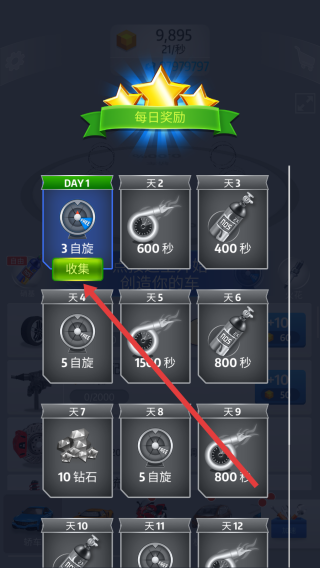 1、打开每日奖励界面,点击DAY1对应的领取按钮,就能得到3次自旋奖励,为后续车辆打造积攒初始资源。