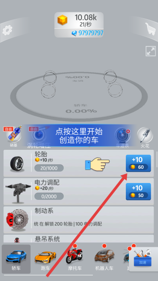 2、进入创造车辆的界面后,找到轮胎右侧那个标有+10的蓝色按钮并点击,这样会消耗60金币来提升轮胎的属性,从而推动造车的进度。