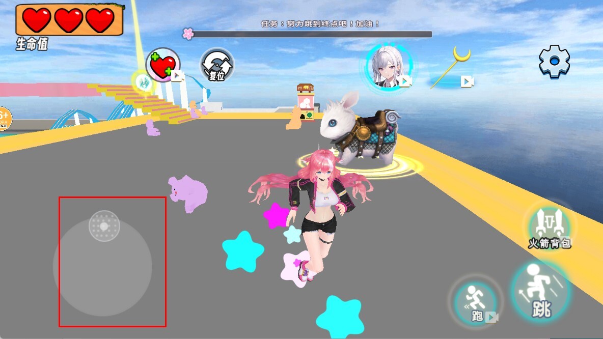 3、进入跑酷场景后,通过操控左侧的虚拟摇杆,可控制角色在场景中的移动方向,以此躲避障碍并朝着终点前进。