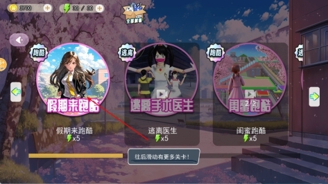 2、关卡选择界面包含“假期来跑酷逃离手术医生”等不同关卡,点击“假期来跑酷”关卡图标,就能进入对应的跑酷场景。