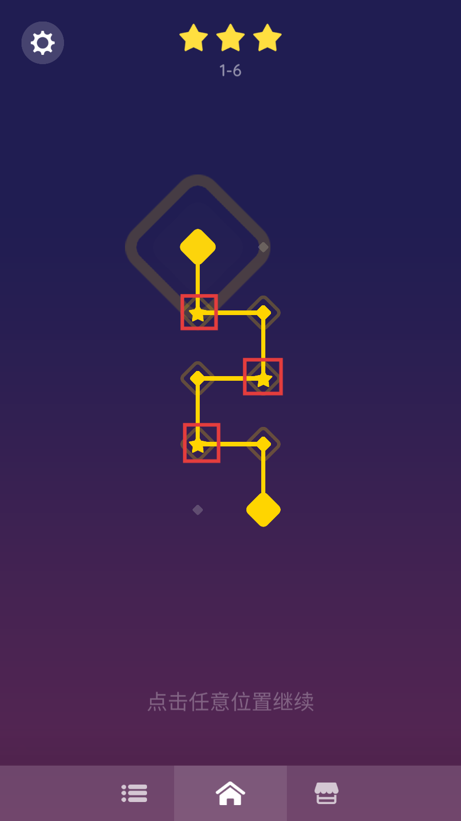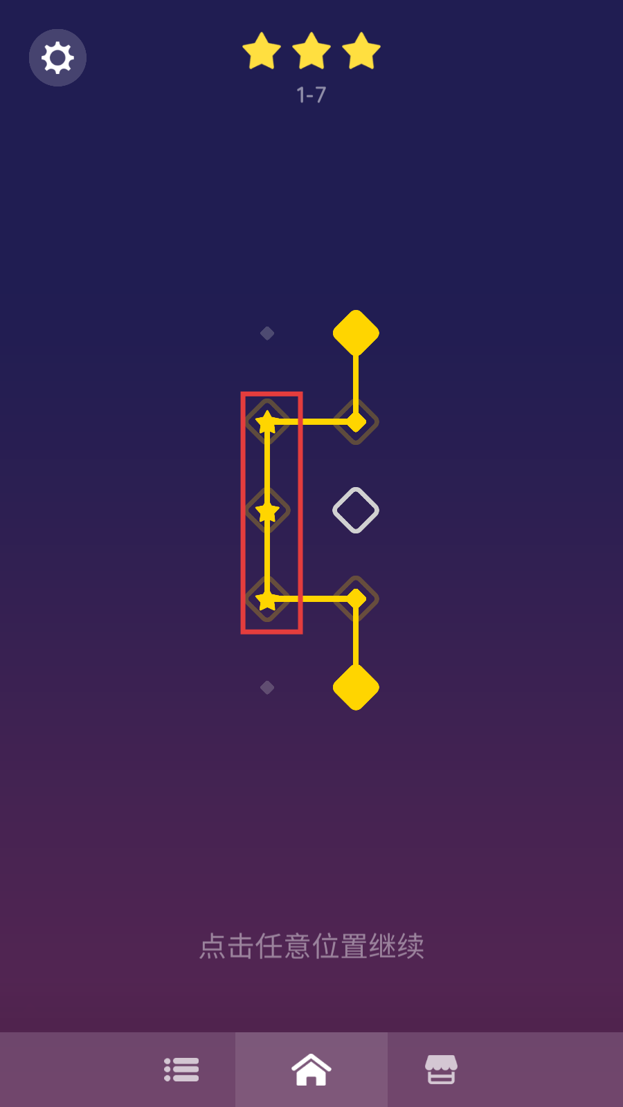 2、在部分关卡里,我们能够沿着黄色连线,合理跳过没有【星星】的连接点,把红框内垂直排列的星星连通起来,可别让路线偏离方向哦。