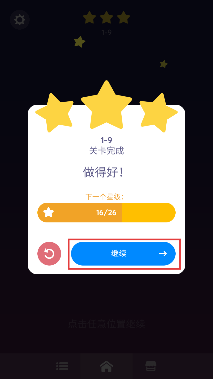 4、完成关卡挑战后,点击【继续】按钮,积累星级,朝着更多关卡前进。