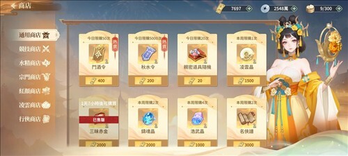 通用商店里的所有商品都得用金券购买。前期我只建议买少量招募令,毕竟抽卡上头是大家常有的情况,稍微买一点问题不大,至少能抽得过瘾。凌云晶是角色晋升到绝世品质所需的进阶材料,目前暂时用不上;三昧赤金则是装备锻造到彩色品质需要的进阶材料,这两样虽然都属于紧缺物品,但可以通过参与活动来获得稳定的获取渠道。昊武晶和名侠谱也是类似的情况,前期不建议购买,后期可以根据自己的紧缺程度和金券剩余情况来酌情考虑是否入手。