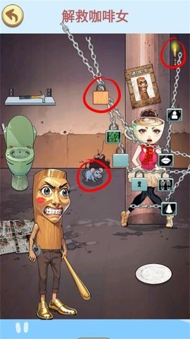 留意咖啡女孩身上铁锁的数量,在图中搜寻相关的钥匙线索,找到这些钥匙就能解开绳索。