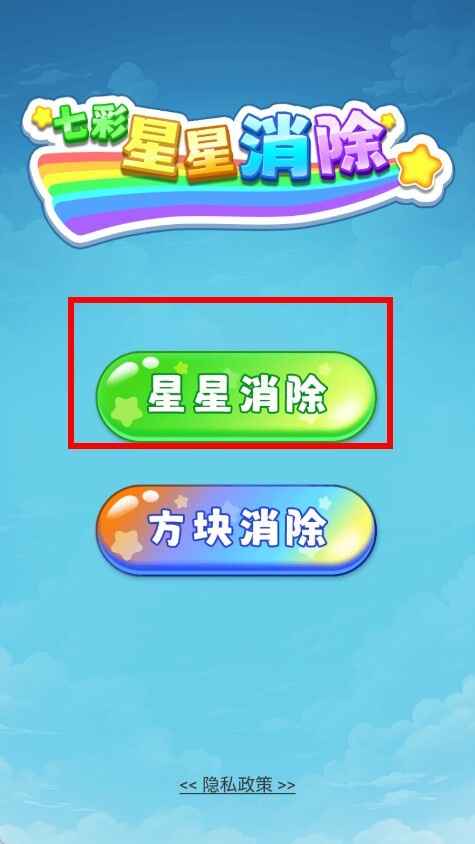 1. 当你进入游戏,映入眼帘的是包含彩虹与星星元素的启动界面。在这个界面上,点击星星消除按钮,就能顺利进入星星消除游戏模式,从而开启充满乐趣的消除挑战。