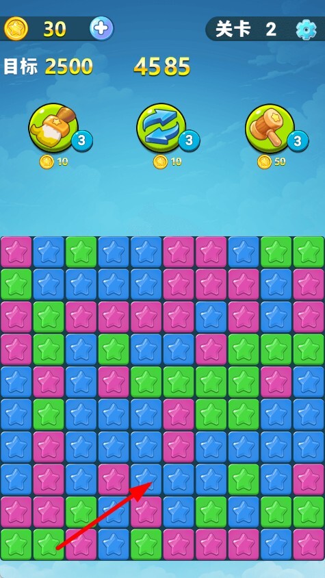 2、进入关卡后,映入眼帘的是布满彩色星星方块的界面。在此界面中,点击颜色相同的星星方块,就能执行消除操作,进而积累分数。