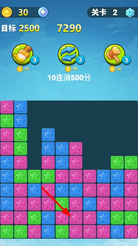3、不断消除星星方块,要是能实现连消,就能得到额外的分数奖励,有助于更快达成关卡目标分数,推动游戏进程。