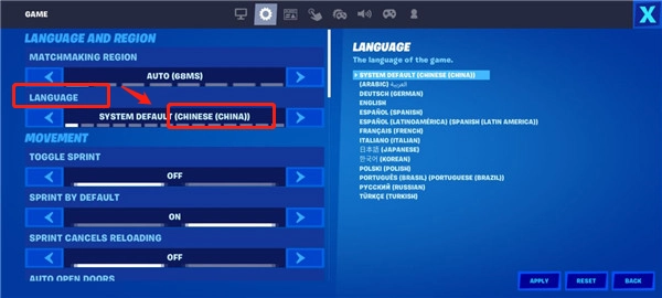 在设置中点击LANGUAGE(语言)选项,选择第一个SYSTEM DEFAULT { CHINESE ( CHINA)}简体中文。