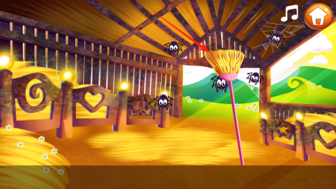 3、先把垃圾和干草都整理妥当,此时房梁上还剩下蜘蛛。接着拿出粉色扫帚,点击蜘蛛,用扫帚将它们扫落并驱赶出去。然后把谷仓里的虫子全部清理干净,让谷仓变得焕然一新,如此便完成了打扫任务。