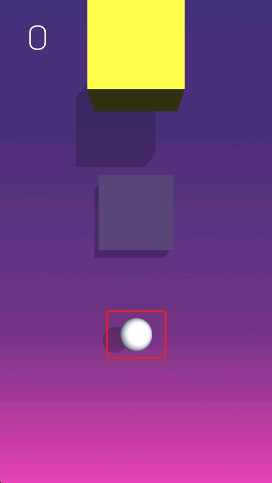 1、游戏开始时白色小球处于底部位置,要注意观察上方黄色与紫色方块的下落动向,提前判断好小球的弹跳时机,为之后顺利穿梭于方块间隙做好准备。