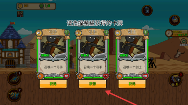 1、游戏开始先领取三个基础火柴人角色,分别是菜刀兵、弓箭手和奶妈,正好凑齐这套标准配置。