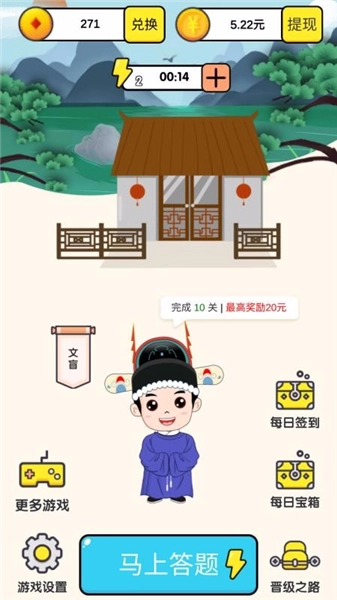 《成语小状元》是一款融合趣味与智慧的猜成语游戏!精心设计的关卡既考验玩家的成语积累,又加入了新颖的养成元素,让你在学习中收获满满的成就感。玩家通过持续答题,能从初出茅庐的小书童,一步步成长为受人敬仰的大状元。不妨来体验一下,你会发现它不仅能带来欢乐,更能成为你成长途中的贴心伙伴。快加入《成语小状元》,挑战自我,成为名副其实的成语大师吧!
