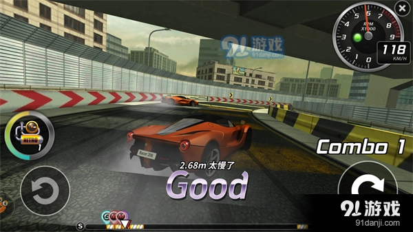 本作的操作方式可以用“简单直接”来概括,屏幕上设有3个虚拟按键,分别对应左右转向和氮气加速,玩家只需在恰当的时机点击相应按键就能完成操作,上手极为容易,堪称手残玩家的“救星”。不过,游戏对操作的精准度要求颇高,若想成为顶尖玩家,仍需持续加强练习。