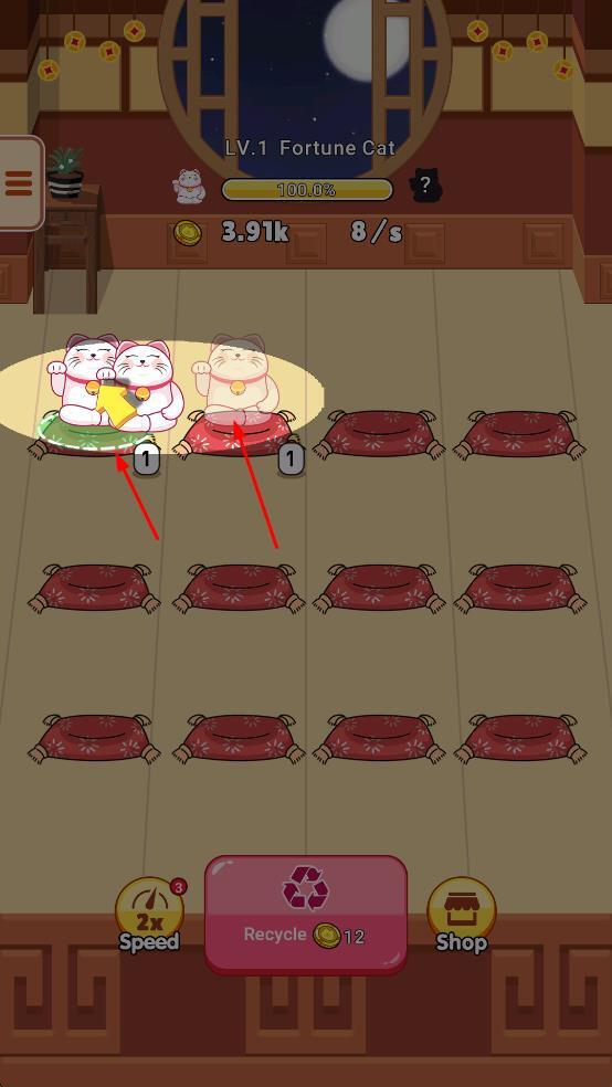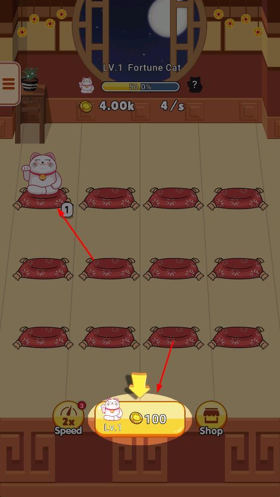 1、消耗金币购买招财猫,放置在红色垫子上。
