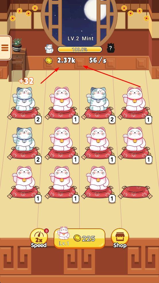 2、合成同等级猫升级,提升每秒金币收益。