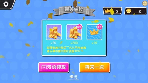 4、每关通关后会有金币奖励,看视频能拿到双倍金币,要是对结果不满意还能重新挑战一次。